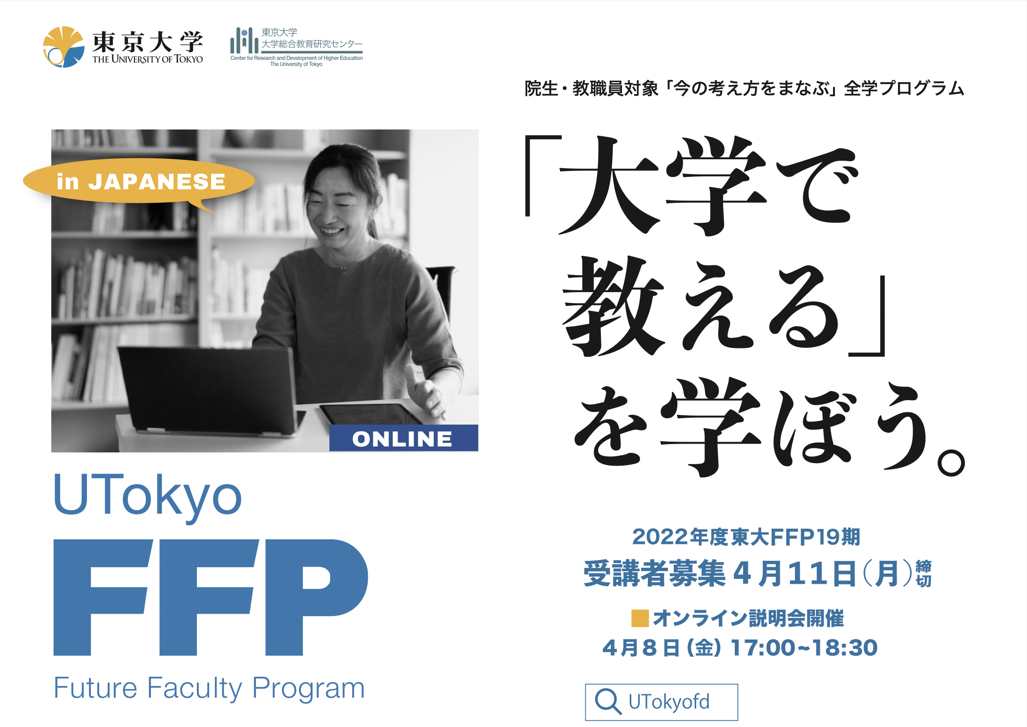 “The University of Tokyo Future Faculty Program” (UTokyo FFP) commenced in AY2013 for acquiring skills and knowledge related to teaching at university. It is aimed at graduate students, postdocs, and faculty/staff members affiliated with the University of Tokyo who aim to become faculty members.