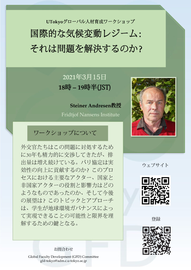 The Fridtjof Nansen Institute(ノルウェー) のSteiner Andresen教授を講師とするグローバル人材育成ワークショップが、3月15日(月)に東京大学駒場のグローバルFD部門の主催で開催されます。