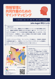 テーマは「情報管理と共同作業のためのマインドマッピング」。このワークショップではマインドマップの基本と、学術的に典型的な使用例を紹介し、主要なソフトウェアのハンズオンタイムを提案します。