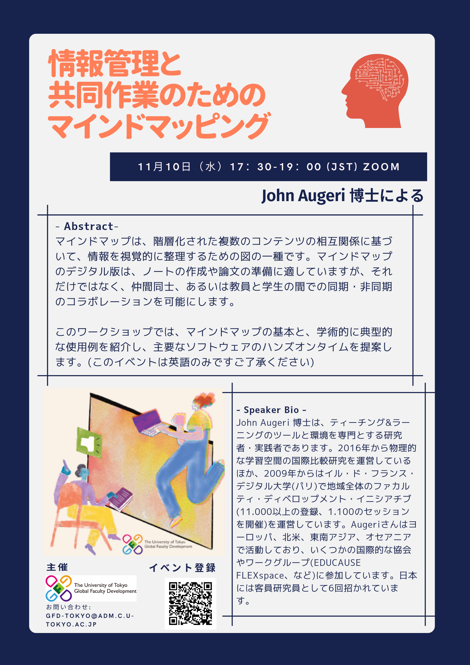 東京大学駒場のグローバルFD部門の主催行事として、John Augeri 博士をゲストスピーカーとするワークショップが、11月10日(水)夜に開催されます。