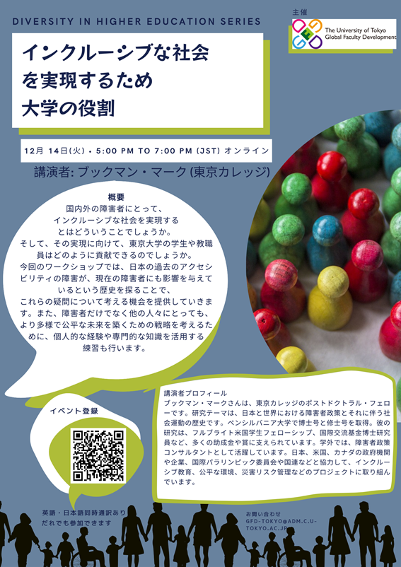 東京カレッジ(*)のMark R. Bookman博士研究員(ポストドクトラル・フェロー)によるワークショップ「インクルーシブな社会を実現するための大学の役割」が、12月14日(火)夜に開催されます。
