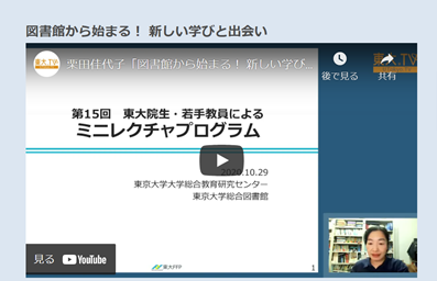昨年10月29日に開催した2020年度「東大院生・若手教員によるミニレクチャプログラム 第15回」を、東大TVで公開しました。